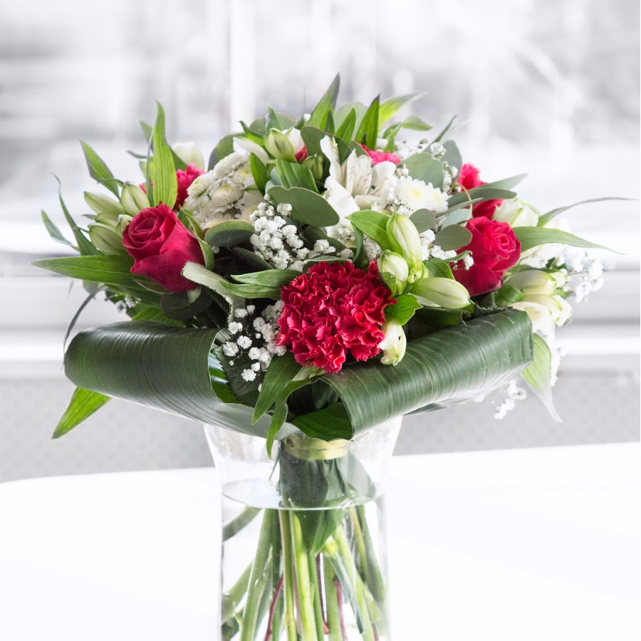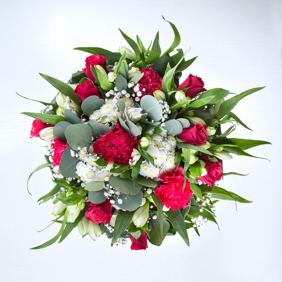 Enhance any occasion with our vibrant and unique bouquet. This stunning arrangement features luxurious red roses, pure white chrysanthemums, and delicate gypsophila, beautifully combined with white alstroemeria and elegant aspidistra leaves.