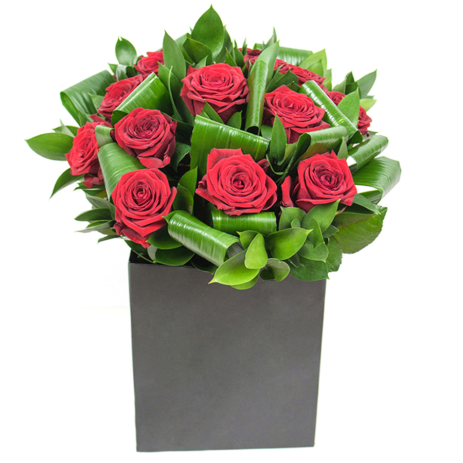 Embrace the timeless beauty of our red rose and greenery arrangement, featuring a stunning mix of aspidistra leaves and ruscus. This bouquet is designed to offer elegance and sophistication, making it a perfect luxurious gift or a graceful addition to your home decor.
