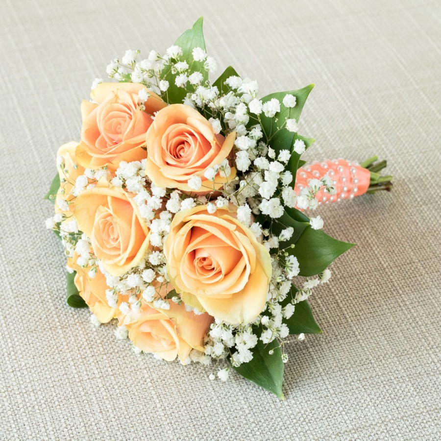 Our beautiful bridesmaid bouquet features vibrant orange roses complemented by soft gypsophila. This elegant arrangement is designed to mirror the bridal bouquet, adding a harmonious and stunning floral touch to your wedding.